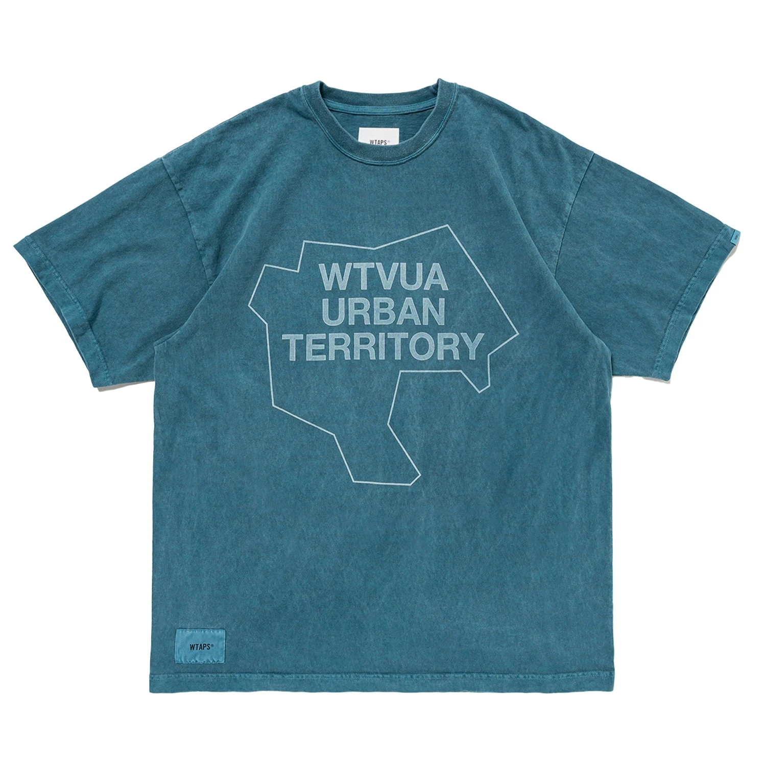 Product dyed T-shirt made of an antiwool blend, reusing yarn scraps that would otherwise be disposed of. Printed motif on the front and embroidered motif in the center of the back.