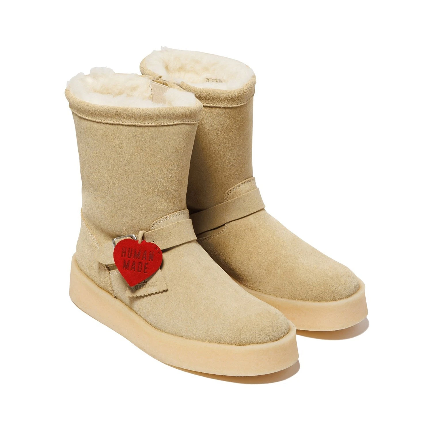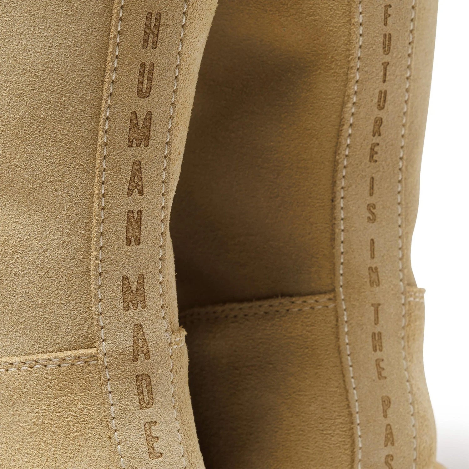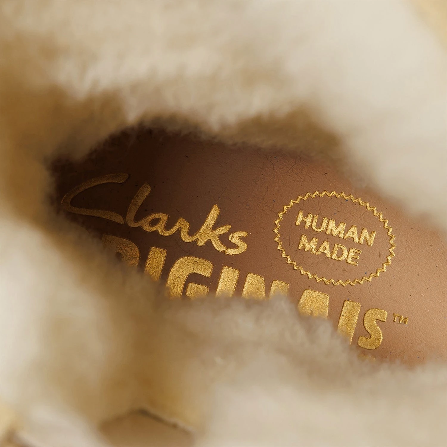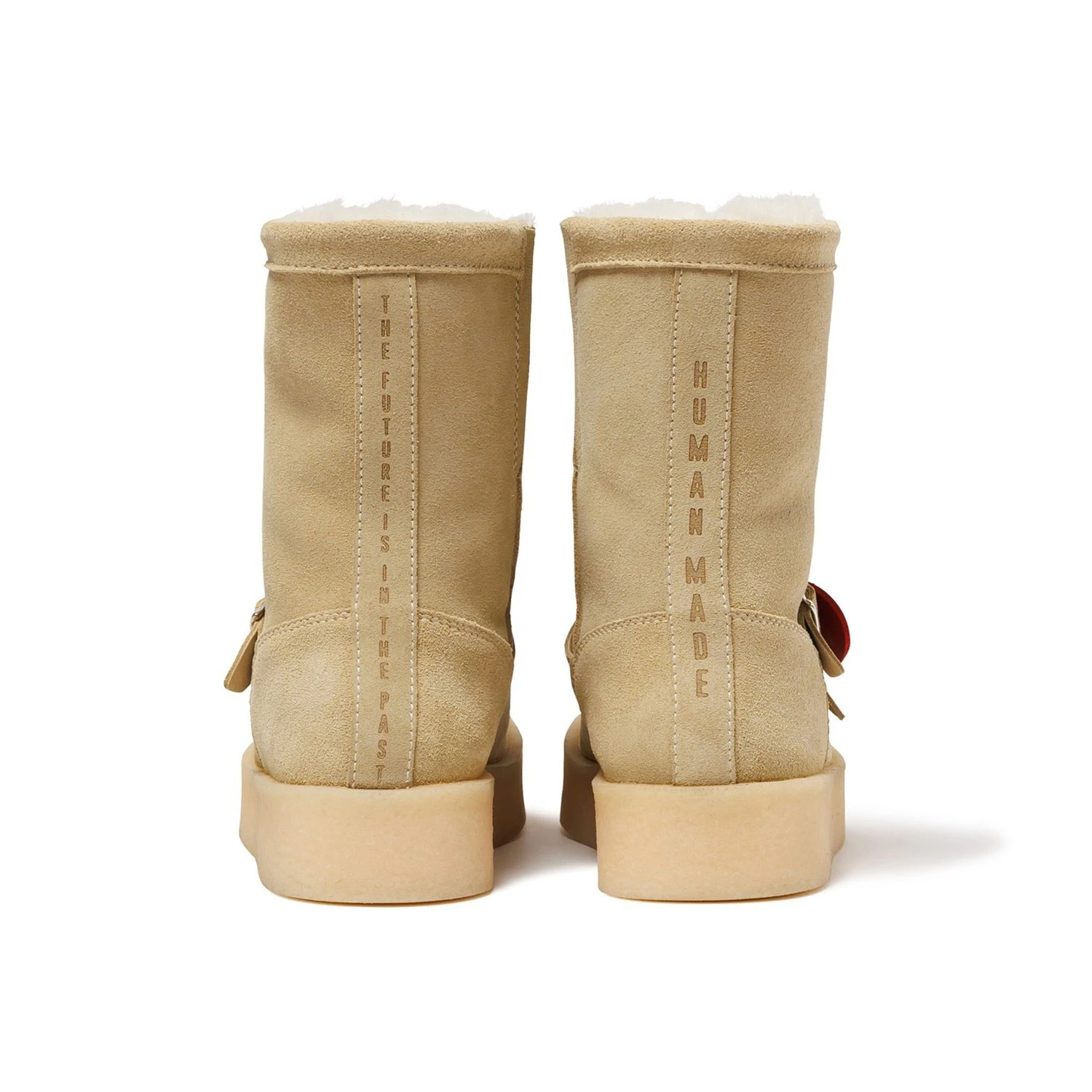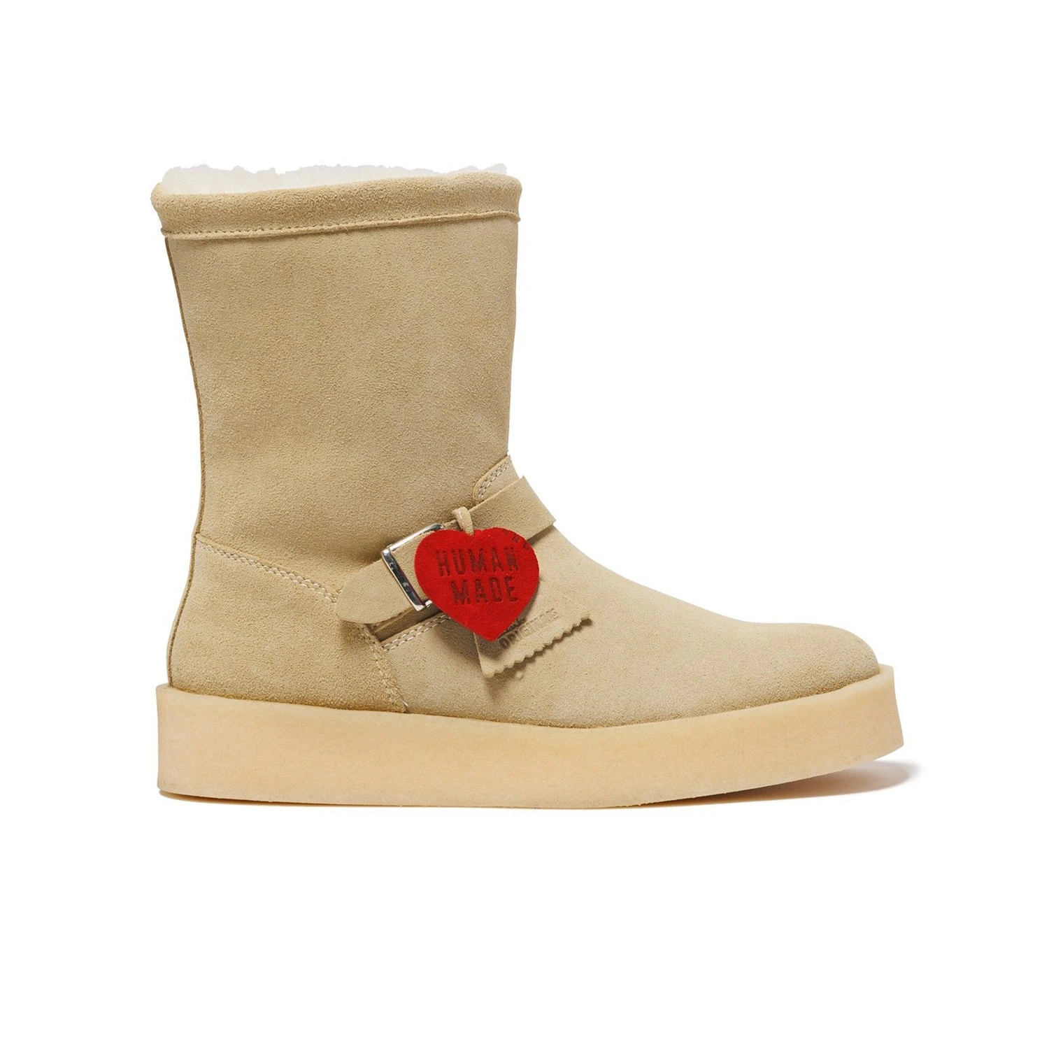 Desert Made shoes produced in collaboration with longstanding British shoemaker Clarks Originals. Created exclusively for this collaboration, the engineer boot comes in classic high-quality maple suede with flexible natural crepe sole and boa fleece lining. A suede heart tag is also attached.