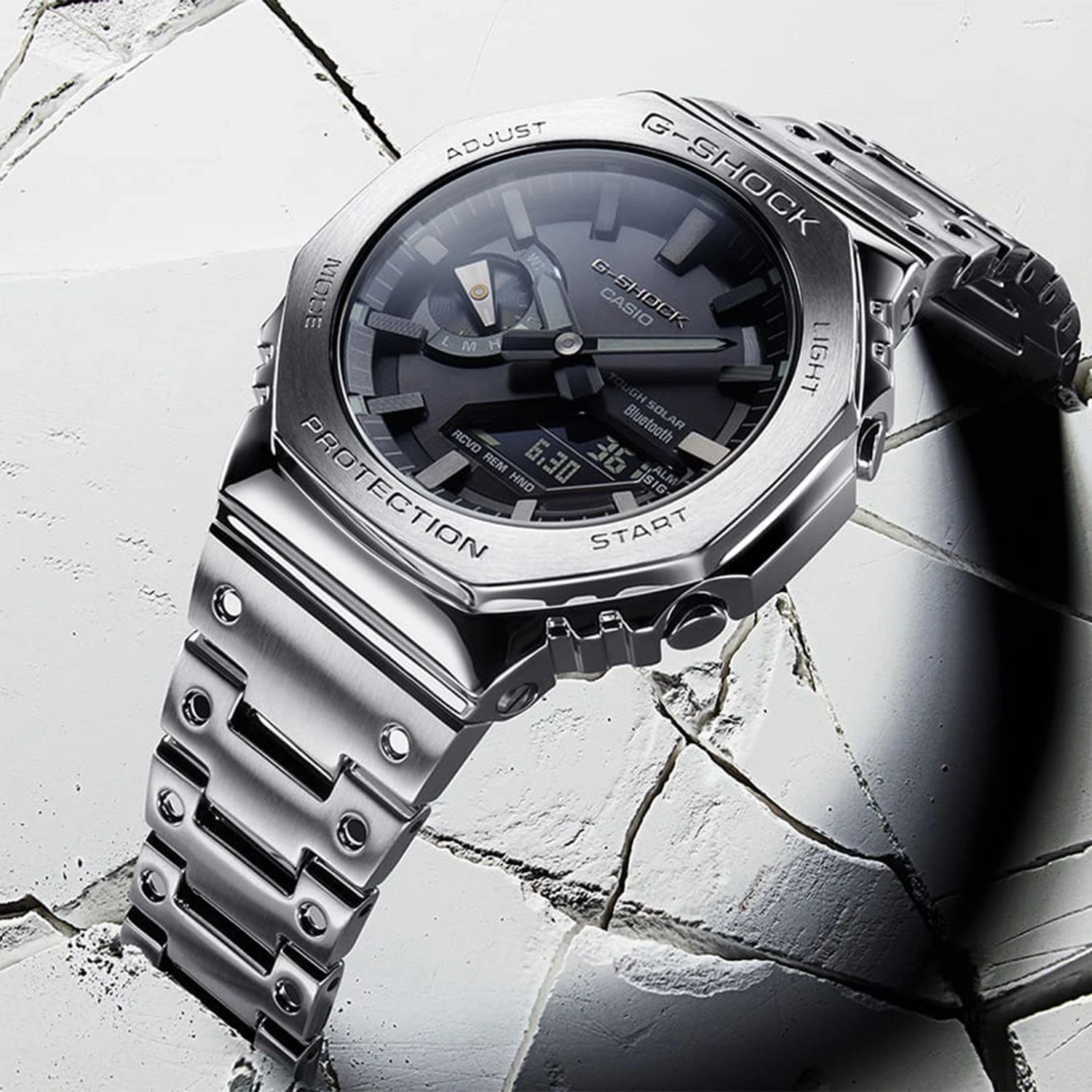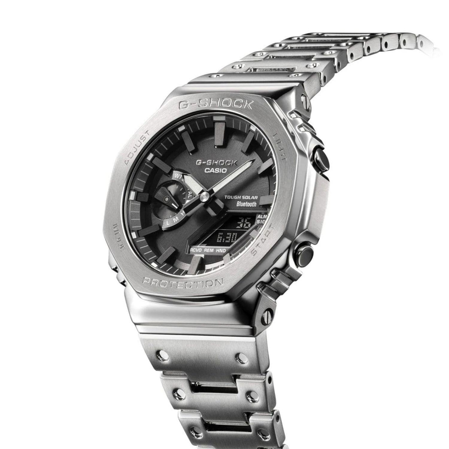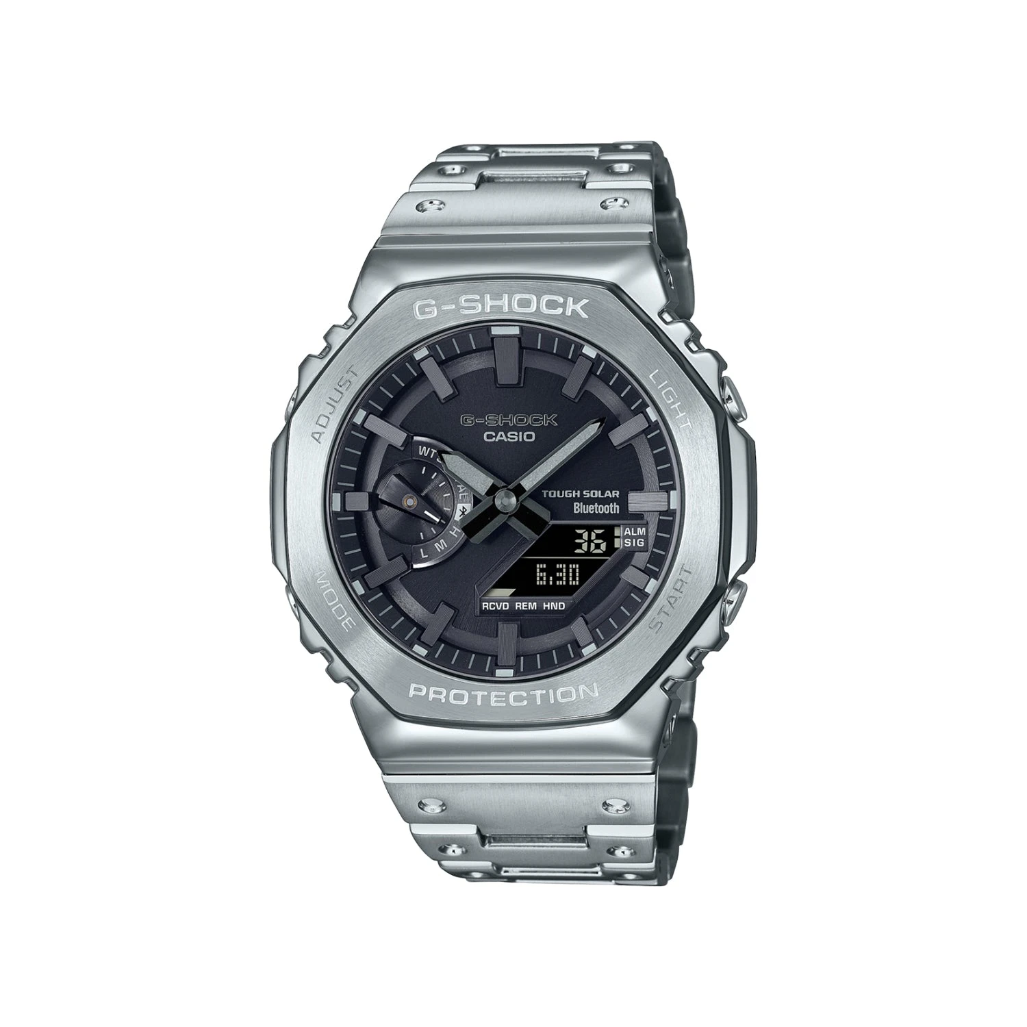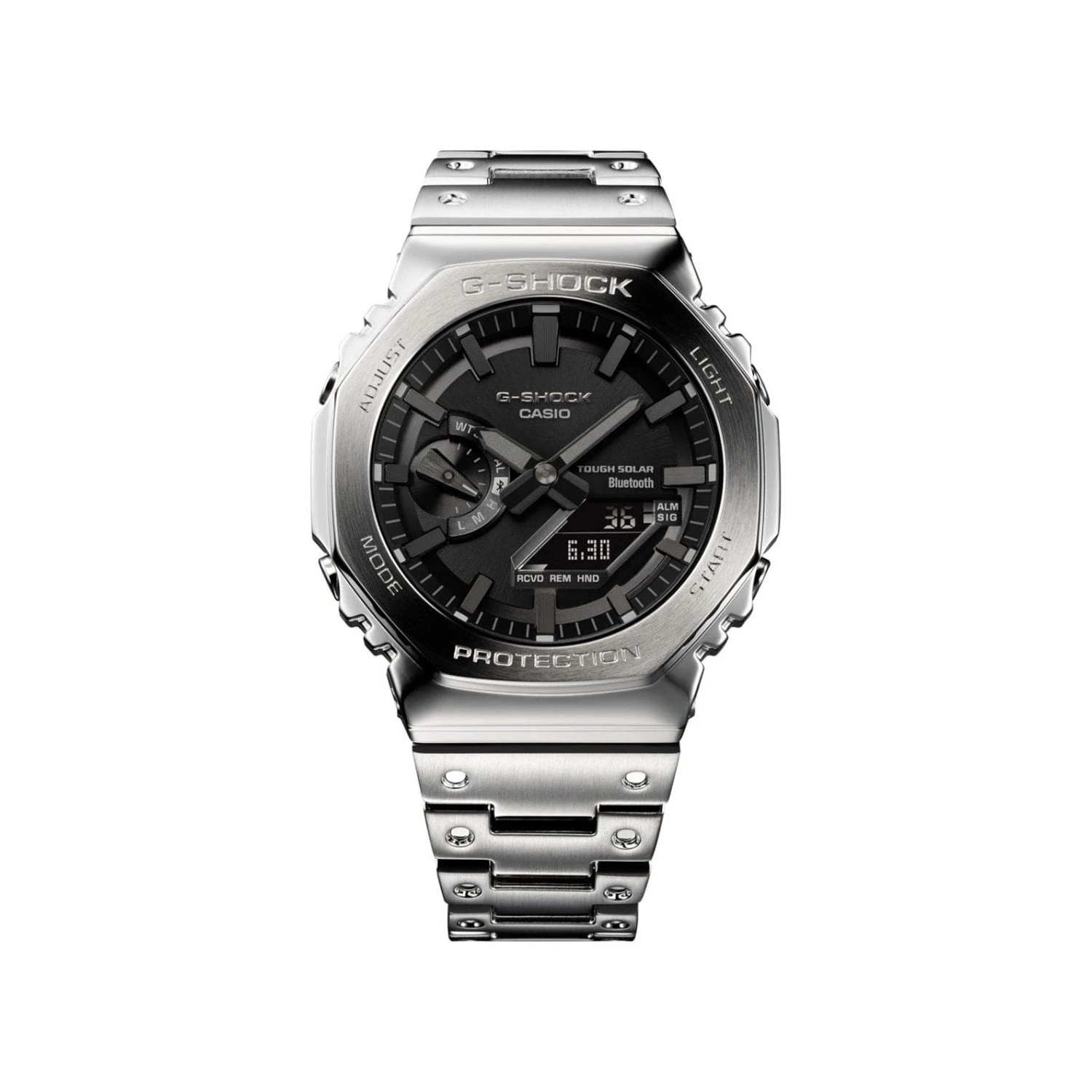 Introducing a new all-metal addition to the ever-evolving 2100 series of timepieces, inheriting the first G-SHOCK, the DW-5000C. Luxurious all-metal construction with a screw-down case back, bezel and band made of stainless steel creates a sleek, minimalist design while protecting the module from shocks when dropped. We bring it back with the original octagonal bezel and accent band design from 1983, all made of metal. The high-density mount keeps the analog-digital combination module slim, while still providing the advanced functions you love in a compact, compact form factor. Pairs with your smartphone via Bluetooth®. Simply log in to the precision timekeeping app to keep you informed. With Tough Solar, an ultra-bright LED light and other convenient functions, this is a timepiece that embodies both style and practicality.