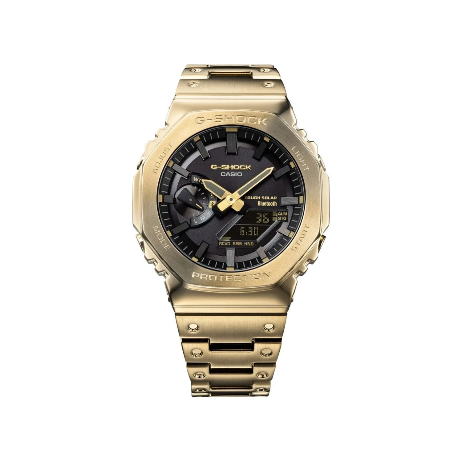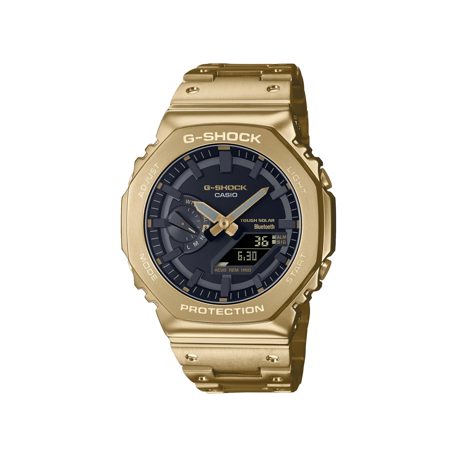 Introducing a new all-metal addition to the ever-evolving 2100 series of watches, inheriting the first G-SHOCK, the DW-5000C. Luxurious all-metal construction with screw-down case back, bezel, and band made of stainless steel creates a sleek, minimalist design while protecting the module from shocks when dropped. A high-density mount keeps the analog-digital combination module slim, while still delivering the advanced functions you love in a compact, compact form. We bring it back with the original octagonal bezel and accent band design from 1983, all made of metal. The bezel and band are coated with yellow gold ion plating. The stainless steel bezel—formed three-dimensionally through a time-consuming process of forging, cutting, and polishing—is finished with beautiful circular fine lines on the surface and a glossy coating on the beveled sections. Pairs with your smartphone via Bluetooth®. Simply log in to the dedicated precision timekeeping app to keep you informed. With Tough Solar, an ultra-bright LED light and a variety of other convenient functions, this is a timepiece that embodies style and practicality.
