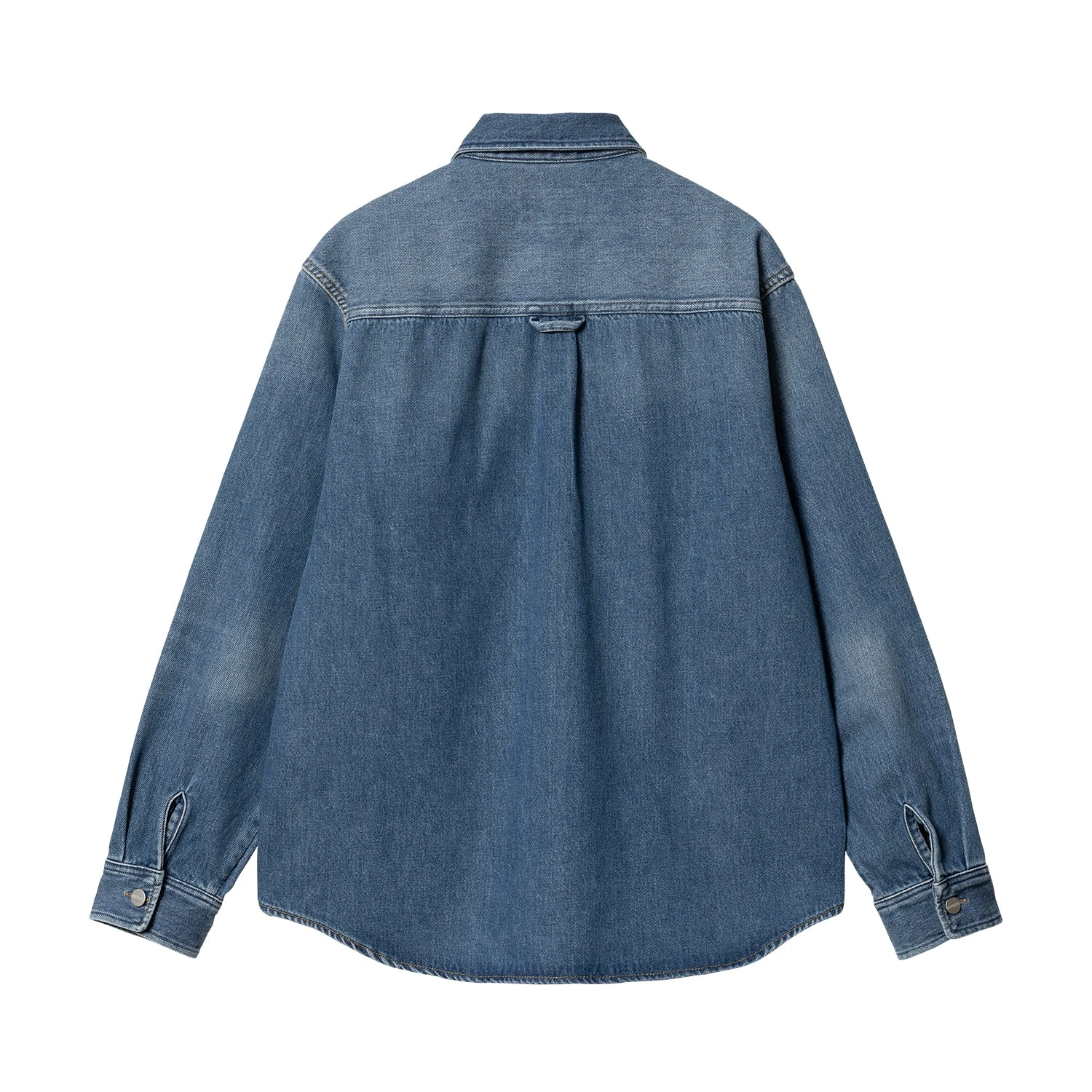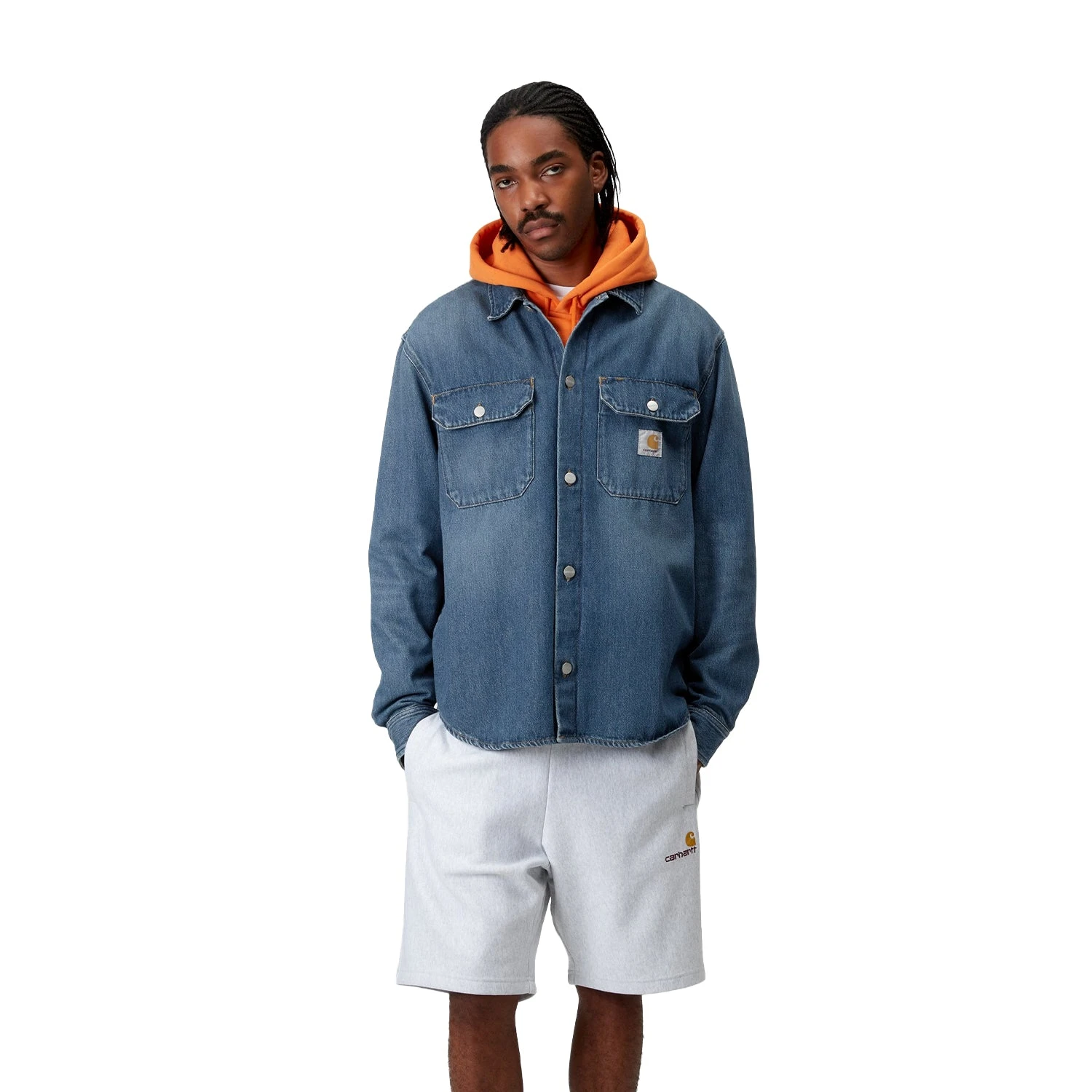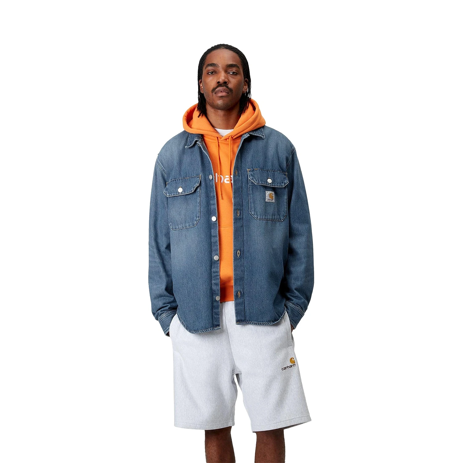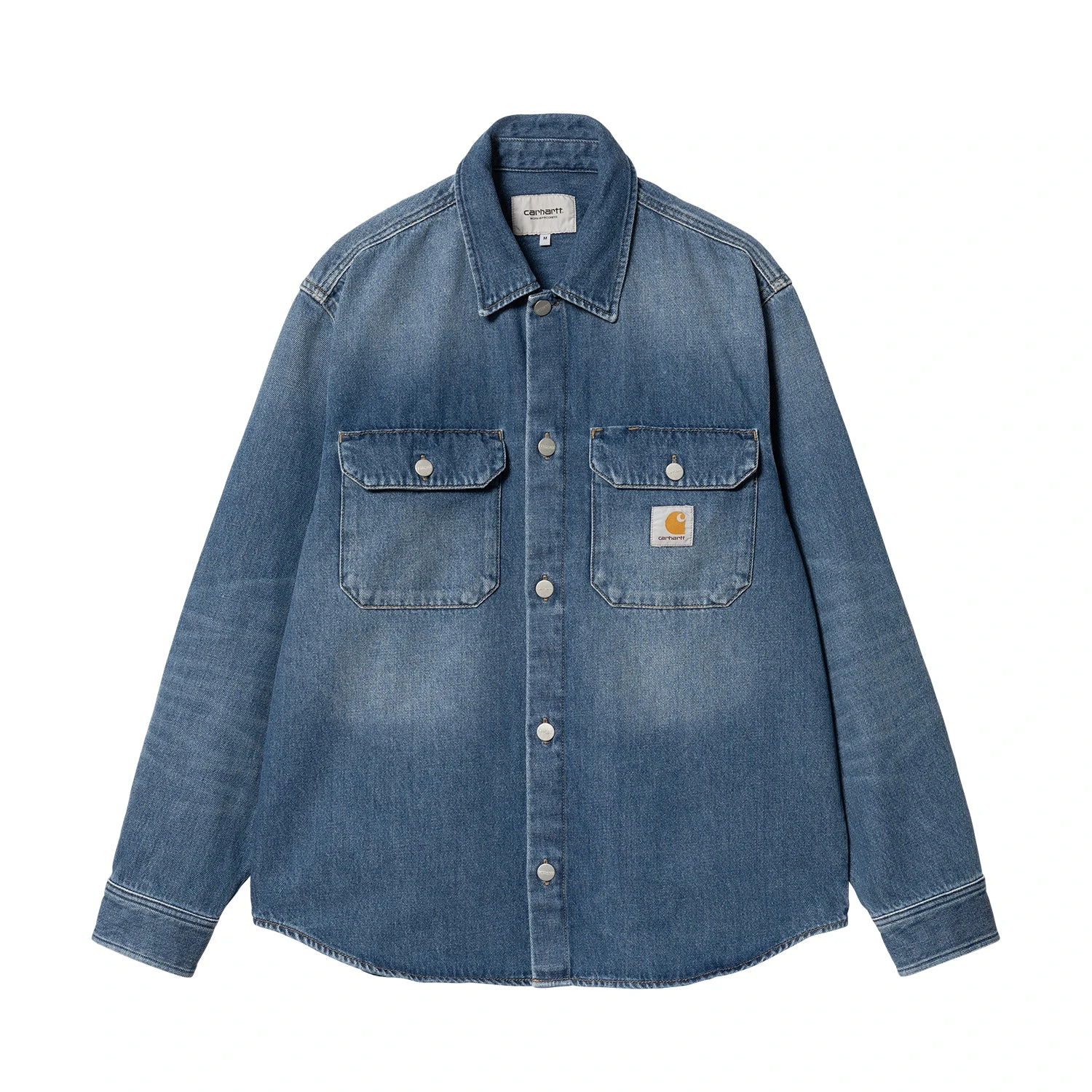 The Harvey Shirt Jacket is constructed from heavyweight cotton denim and is unlined. The item comes in a dark used wash version for a saturated yet worn-in finish, and a stone-bleached iteration for a lighter appearance. Two flap and summary pockets appear on the front. A woven Square Label completes the design.