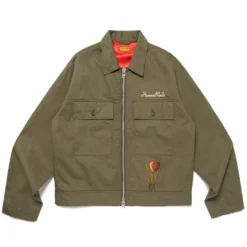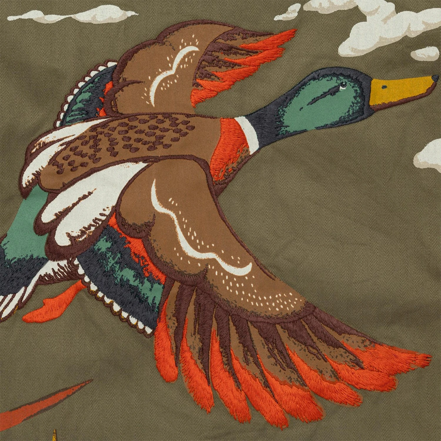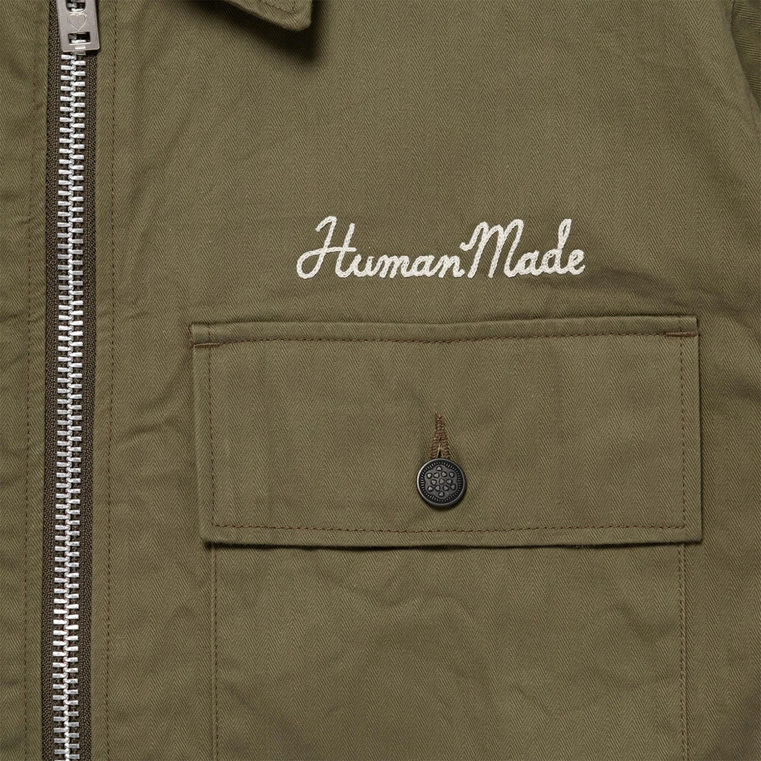 Military-style jacket made with U.S. Army herringbone fabric. Graphics adorn the back, expressed with a mix of print and embroidery.