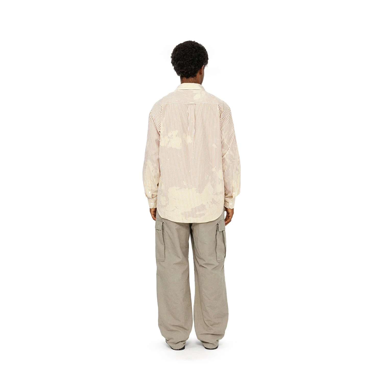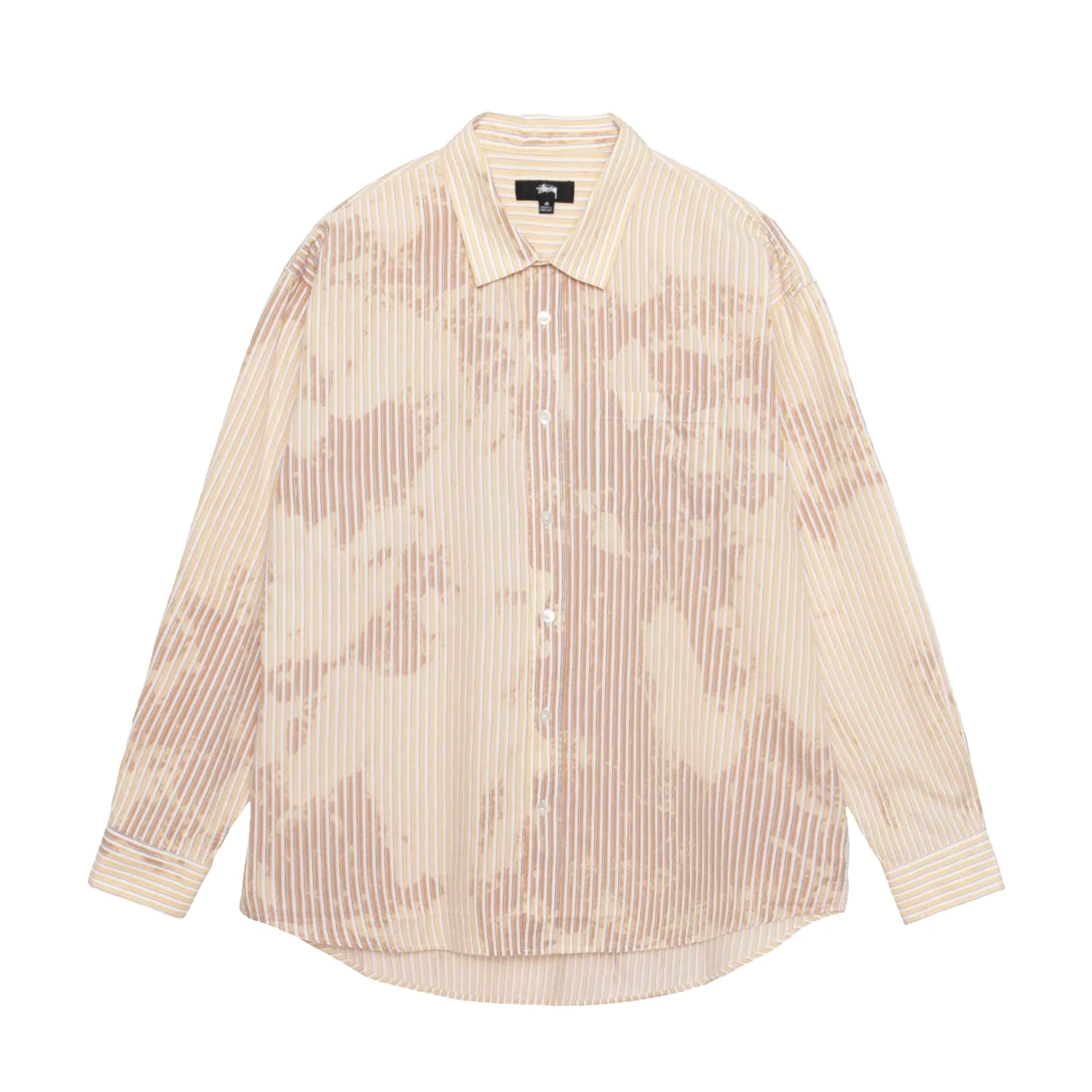 Boxy fit striped shirt in striped cotton poplin with a bleached effect. Features a single patch pocket above Stüssy swirly “S” embroidery.