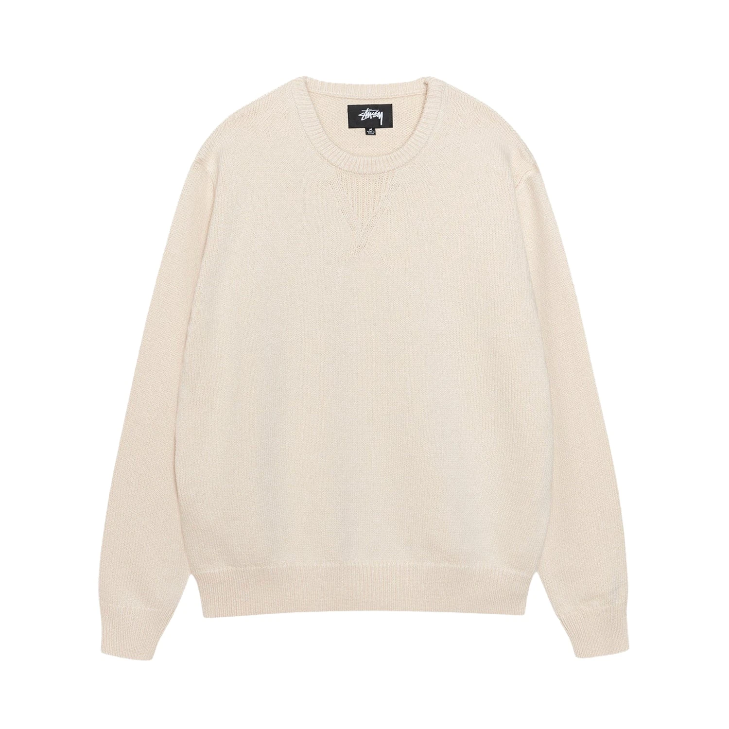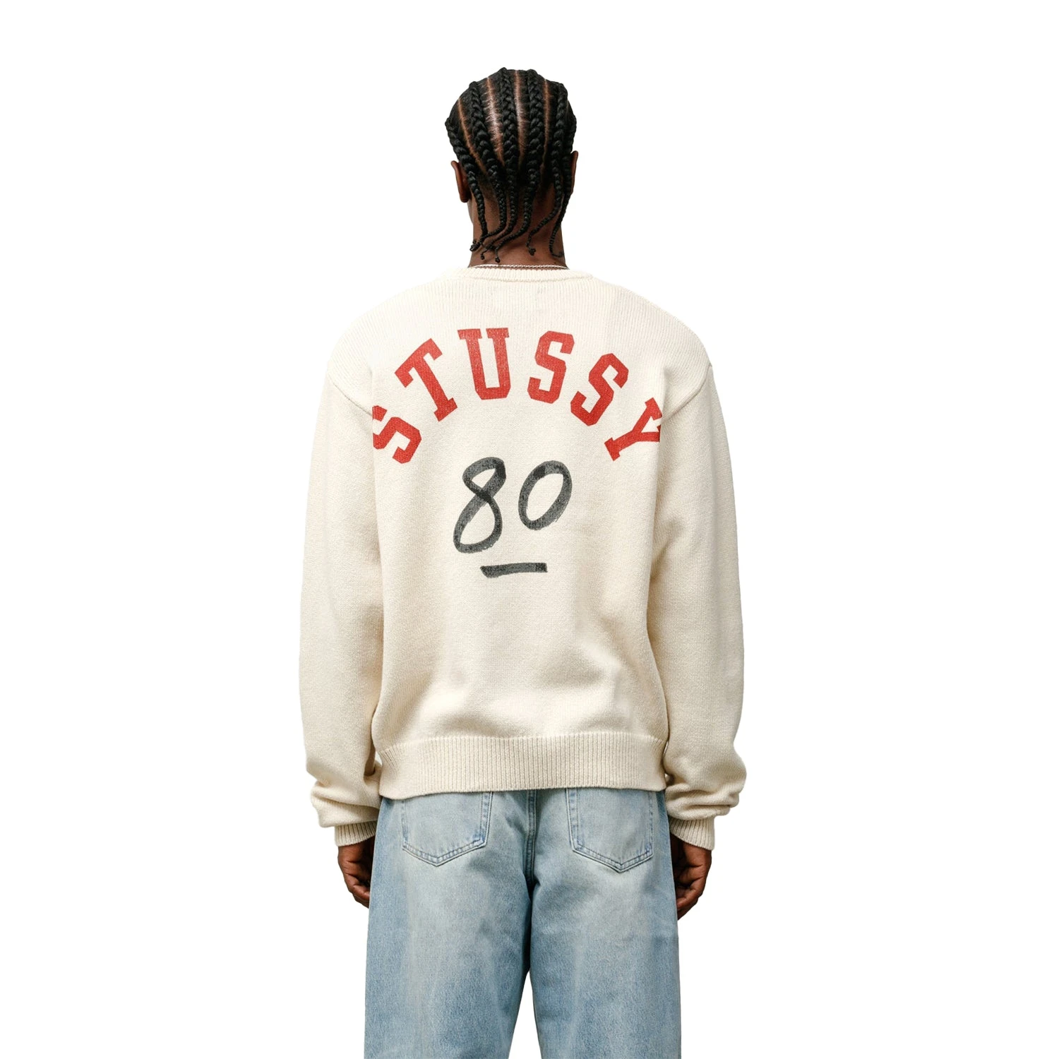 Relaxed fit sweater in a superfine merino and cotton blend knit. Stüssy artwork printed across the back.