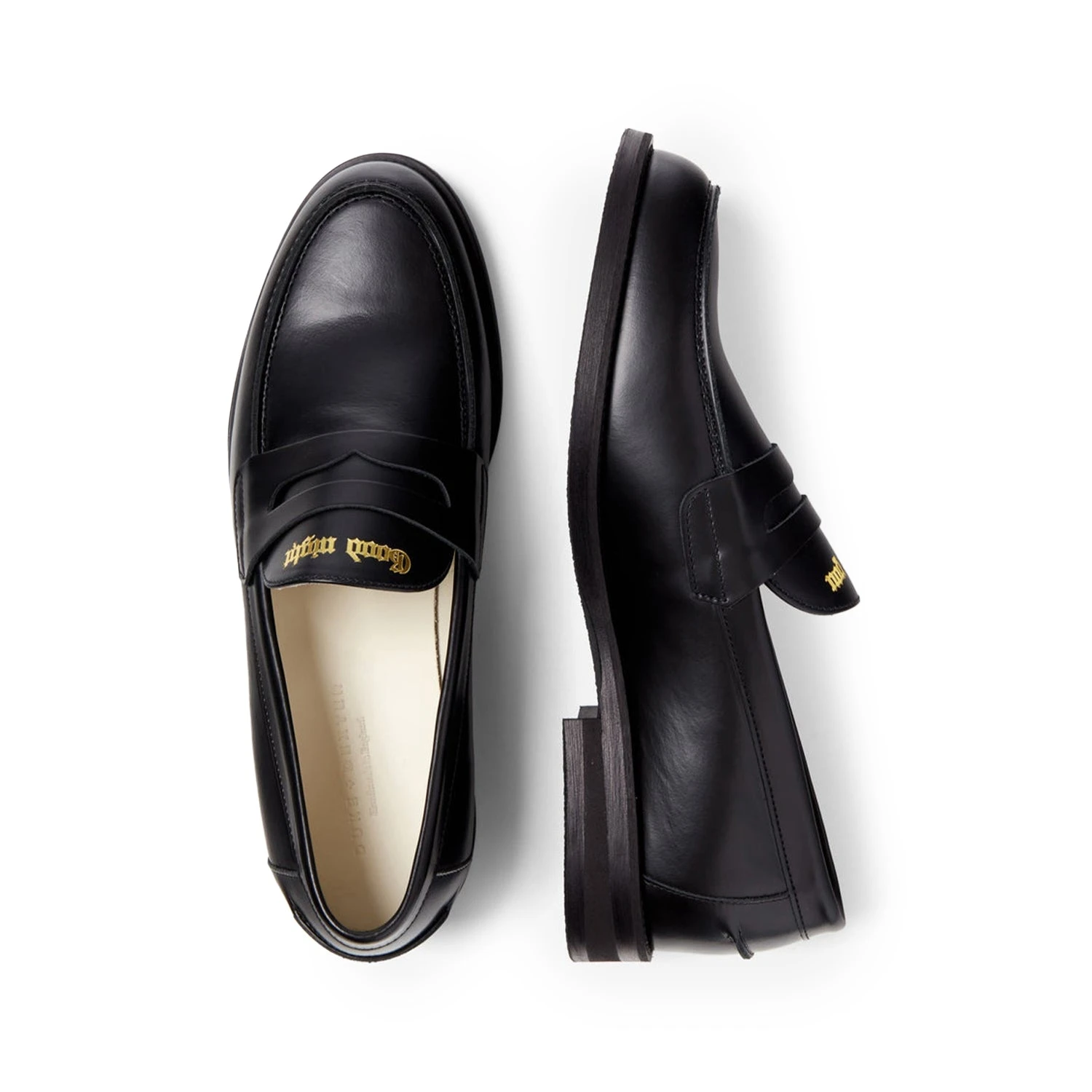 The ultimate sign off. Positioned just above the bridge, the Thank You, Good Night Penny Loafer features this iconic phrase gold foil embossed directly onto the blank vamp of our Wilde Penny Loafer, sat atop our 25mm compounded rubber sole and lined in a premium Italian leather.